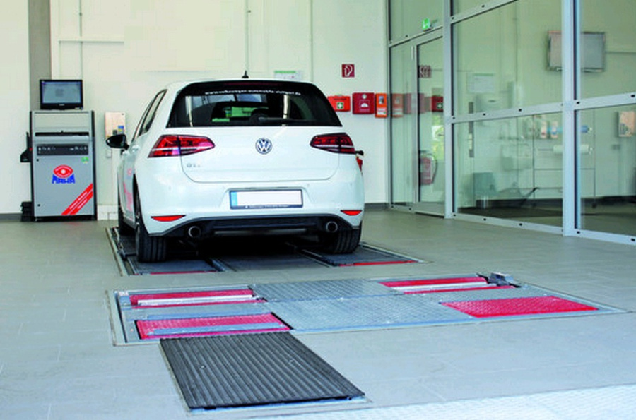 Для проведения теста автомобиль просто проезжает одним колесом по пластине в положении руля прямо.