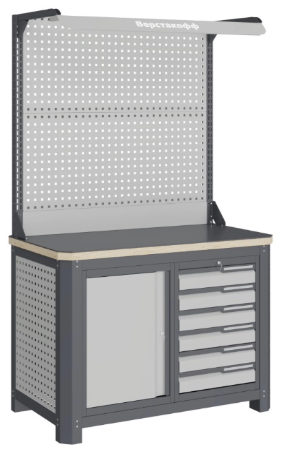 Cостоит из столешницы шириной 1193 мм, рамы верстака, состоящей из опор, перемычек, боковых перфопанелей, небольшого модуля с ящиками S6 и модуля S7 ( c дверцей), двойной экрана с кронштейнами и комплектом освещения