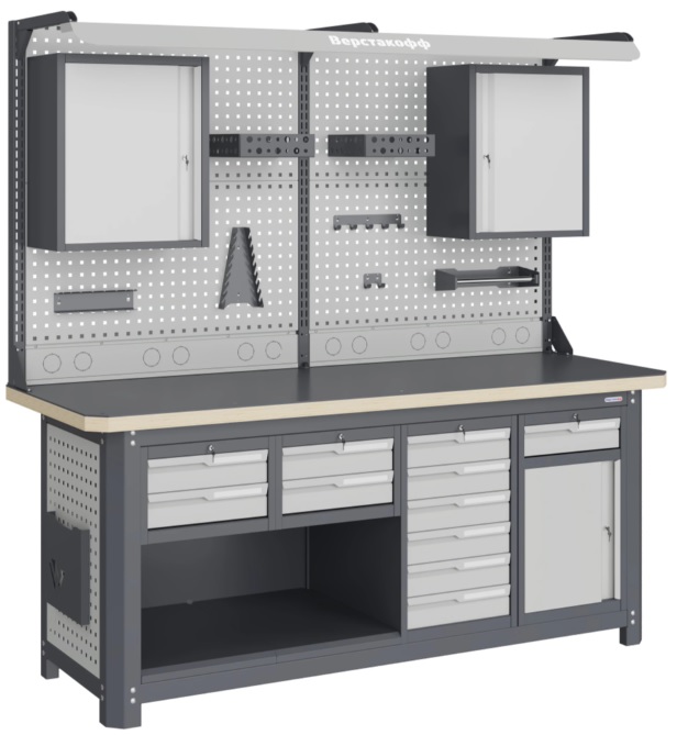 Состоит из столешницы шириной 1993 мм, рамы верстака, состоящей из опор, перемычек, боковых перфопанелей, двух модулей S6 и S8, два модуля S2 c комплектами полка-стенка SW2, двойного экрана с кронштейнами, комплекта освещения и блока коммуникаций.